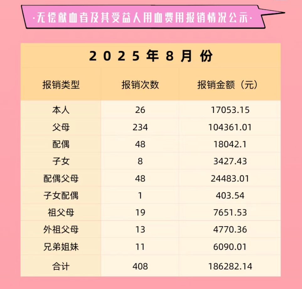 2025年8月份淄博市无偿献血者及其受益人用血费用减免情况公示