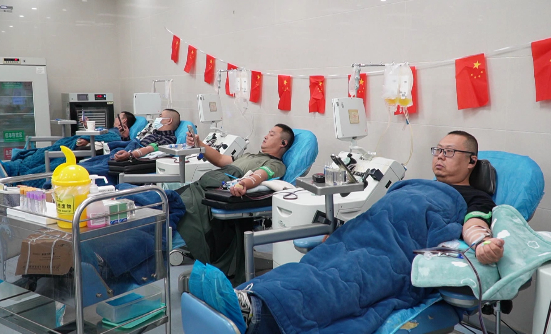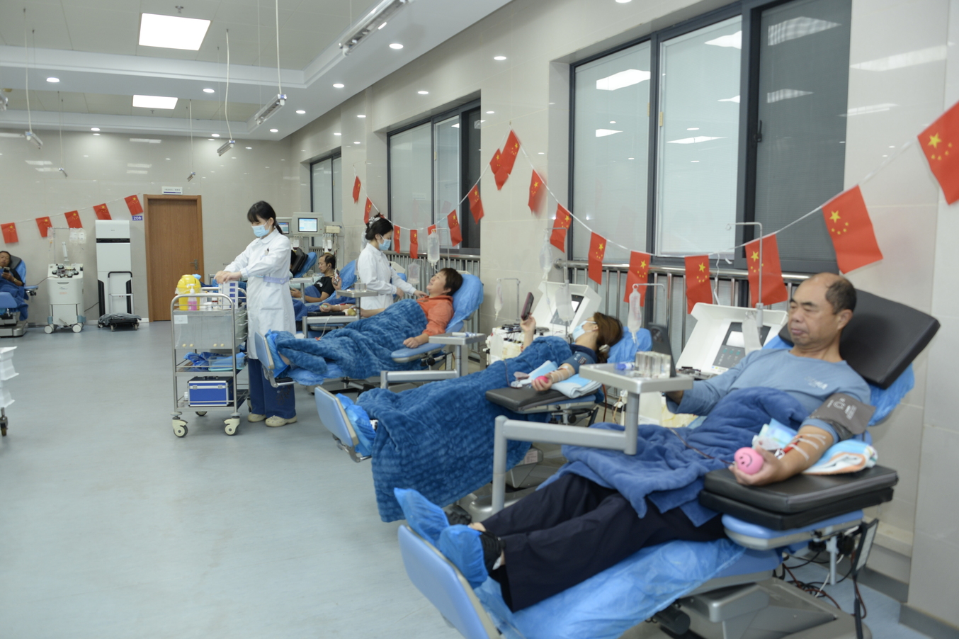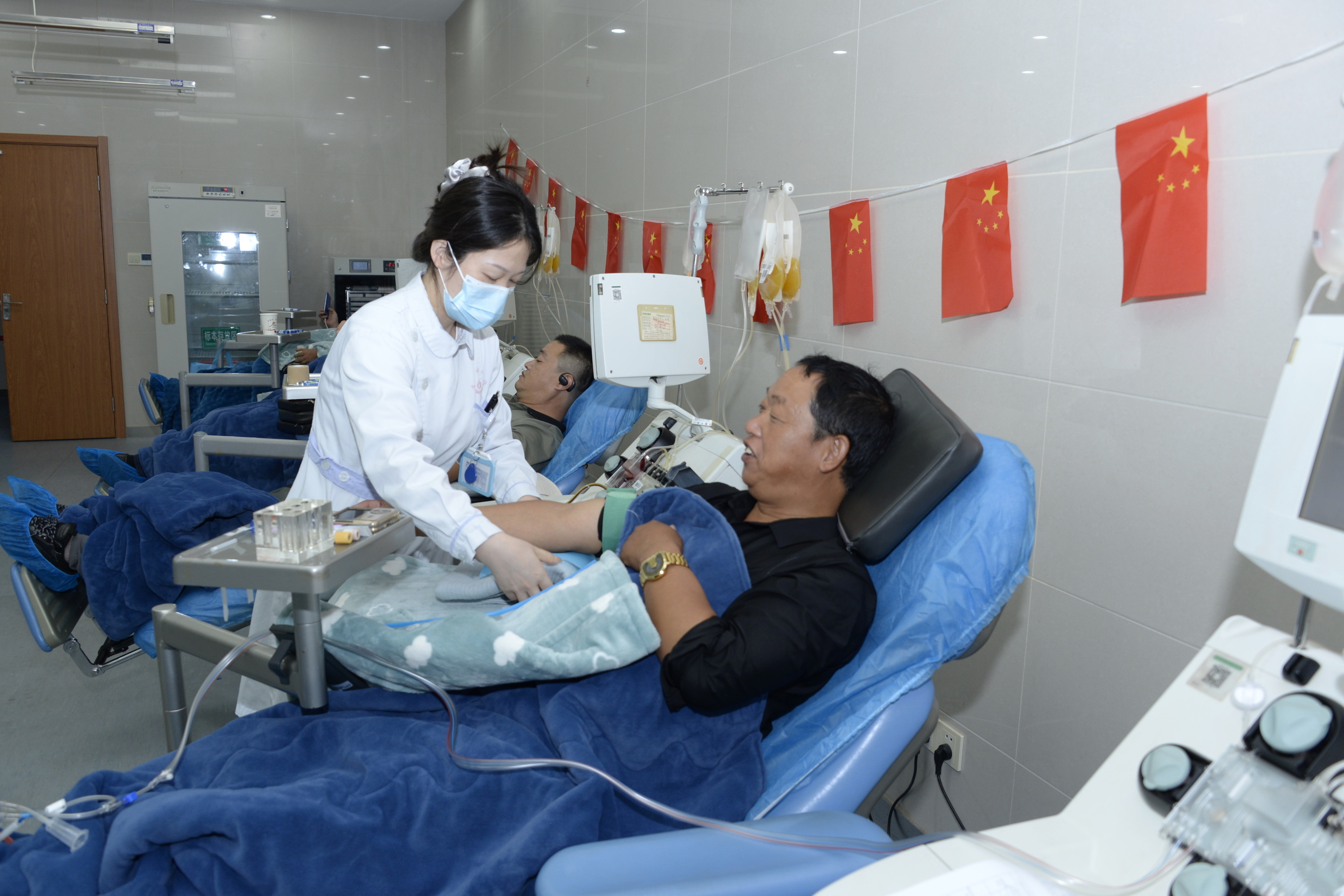 另一边的采血椅上,“老熟人” 庄严培正平静地献血——这已经是他第95 次参与无偿献血了。