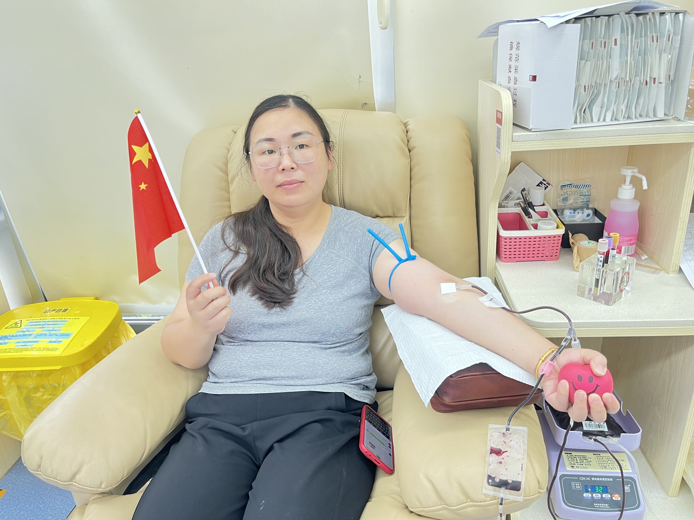 “以前总觉得‘为祖国庆生’是很宏大的事,没想到普通人也能靠献血这样的小事,送上自己的心意。”护士为她扎上止血带、消毒皮肤时,孟芹深吸了一口气,可当看到采血袋慢慢开始充盈,她的紧张渐渐消散,“你看,好像也没那么难!以后要是有机会,我还想再来。”