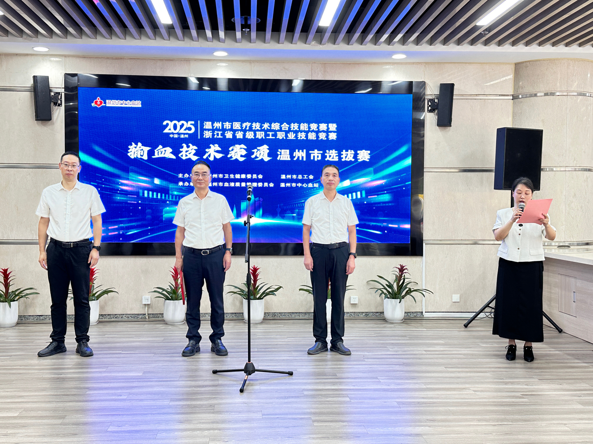 温州市卫生健康委党委副书记、工会工委主任林晓江,温州市总工会党组成员、二级调研员吴客竹,温州市中心血站党总支书记、站长陈栋出席选拔赛开幕仪式。