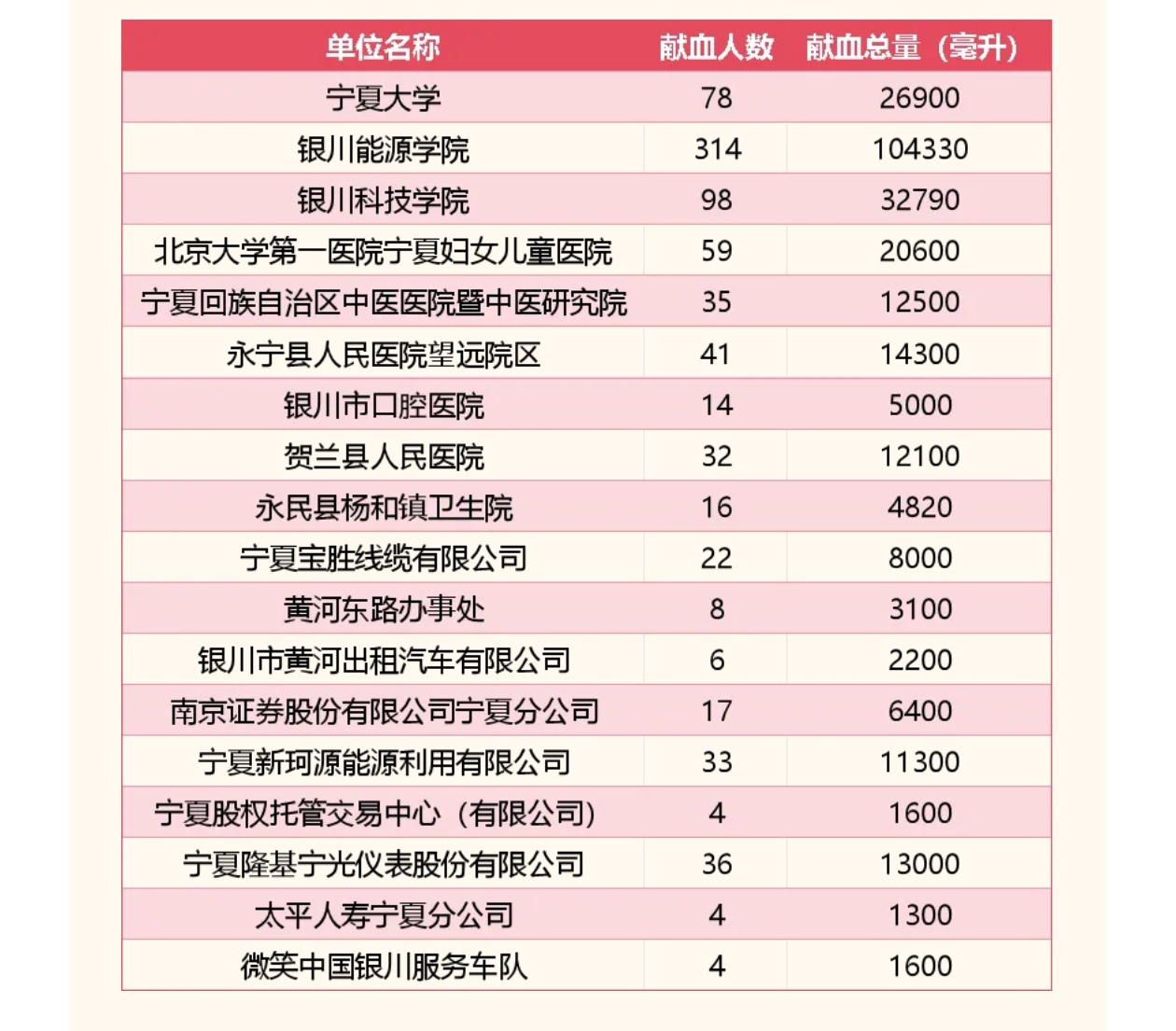 各企事业单位与社会组织以实际行动践行社会责任,134名爱心职工累计献血近5万毫升。宁夏隆基宁光仪表股份有限公司36人、宁夏新珂源能源利用有限公司33人主动参与,微笑中国银川服务车队的“的哥的姐们”更是利用工作间隙加入爱心队伍。不同行业的奉献者以“一臂之力”传递温暖,让民族团结的种子在血脉交融中悄然绽放。
