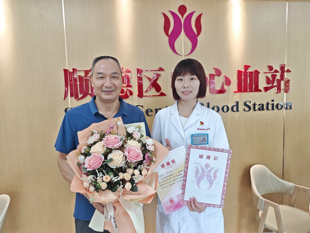 廿载献血路,终点亦是起点的荣光与传承。在爱心涌动的现场,大良梁开初级中学的语文教师严晓春的身影显得格外沉静而动人。从2001年在北滘林头中学第一次勇敢地伸出手臂,至今他已累计献血20次,献血总量达7100毫升。二十余载春秋,一份默默的坚持,足以汇成一条生命的暖流。