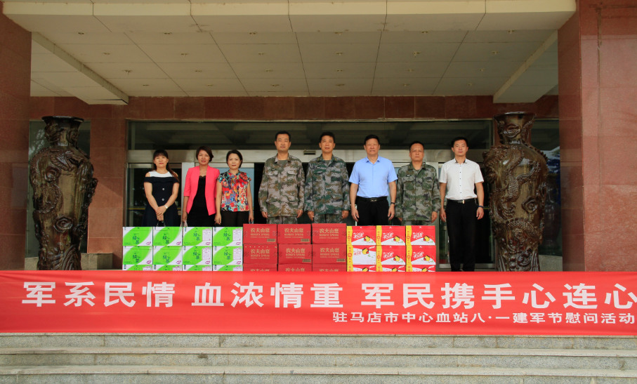 8月7日,驻马店市中心血站慰问领导一行人走访慰问驻确山某部队,对人民子弟兵多年来支持无偿献血事业表示感谢。