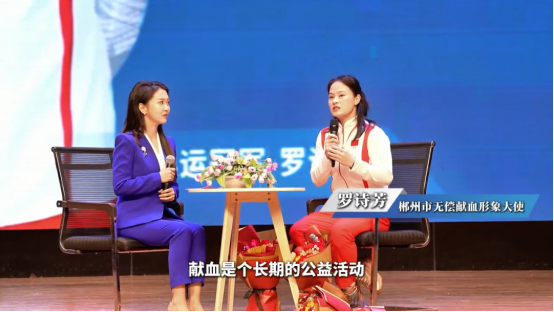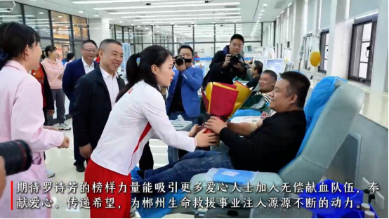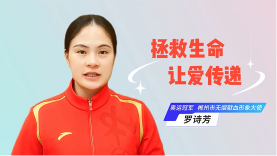 大家好,我是郴州市无偿献血形象大使、奥运冠军罗诗芳。奥运举重赛场上,我举起的是梦想的杠铃;而作为无偿献血形象大使,我更渴望与您共同托起生命的希望,唯有持续不断的爱心接力,才能构筑生命的防洪堤。加入我们,拯救生命,让爱传递!