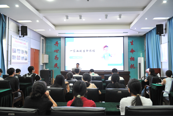 参观完业务科室,学生们到六楼多媒体教室认真聆听了由宣传信息科科长罗覃主讲的“一袋血的旅程”专题讲解。通过PPT演示,系统了解了血液知识、分离与制备、检验与储存以及献血的意义等相关内容,更加直观地感受和了解到血液从采集、成分制备、检测、储存以及发放的全过程,“一袋血的旅程”让在场的学生们对血液安全有了更深刻的认识。