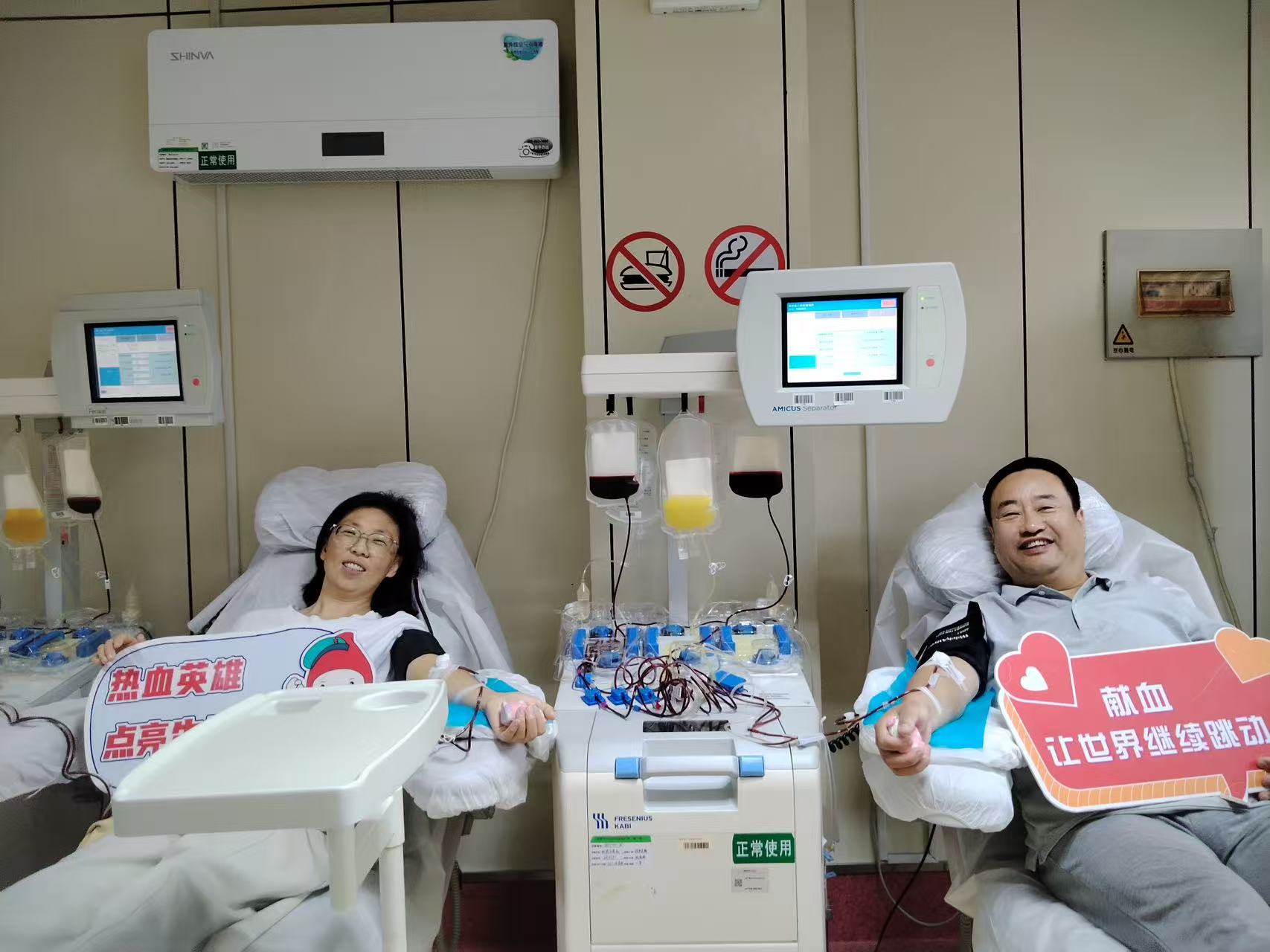 在淄博市中心血站机采室,一场特殊的 “银婚纪念仪式” 正在温馨上演。血站职工吴慧和她的丈夫,为庆祝结婚 25 周年,选择了捐献血小板这种充满爱与奉献的方式,为彼此的银婚纪念添上了浓墨重彩且意义非凡的一笔。