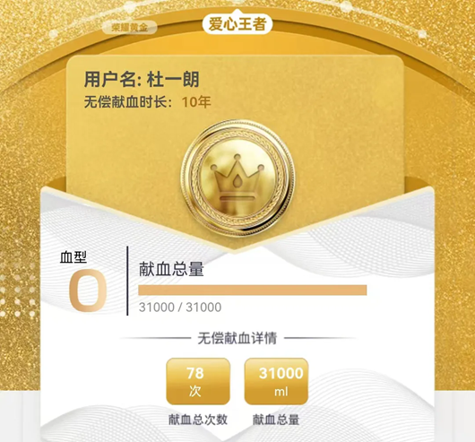 10月26日,杜一朗来到咸阳市人民路咸阳血站机采献血屋,第78次参加无偿献血。他的献血量达到31000毫升,先后荣获全国无偿献血奉献奖铜奖、银奖和金奖,成为兴平市公职人员中的爱心榜样。
