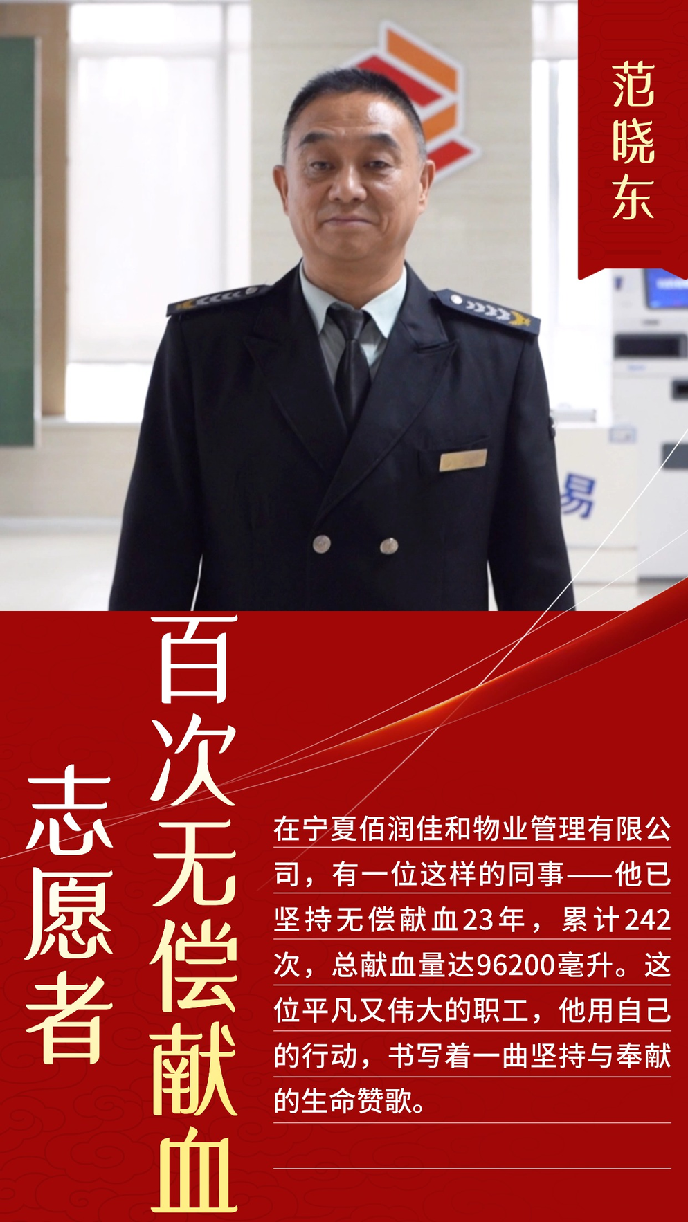 在宁夏佰润佳和物业管理有限公司,有一位这样的热心同事员工——他已坚持无偿献血23年,累计献血242次,总献血量达96200毫升(其中捐献全血7次2800毫升,血小板235次467个治疗量)。这位平凡又伟大的员工叫范晓东。他用自己的行动,书写着一曲坚持与奉献的生命赞歌。