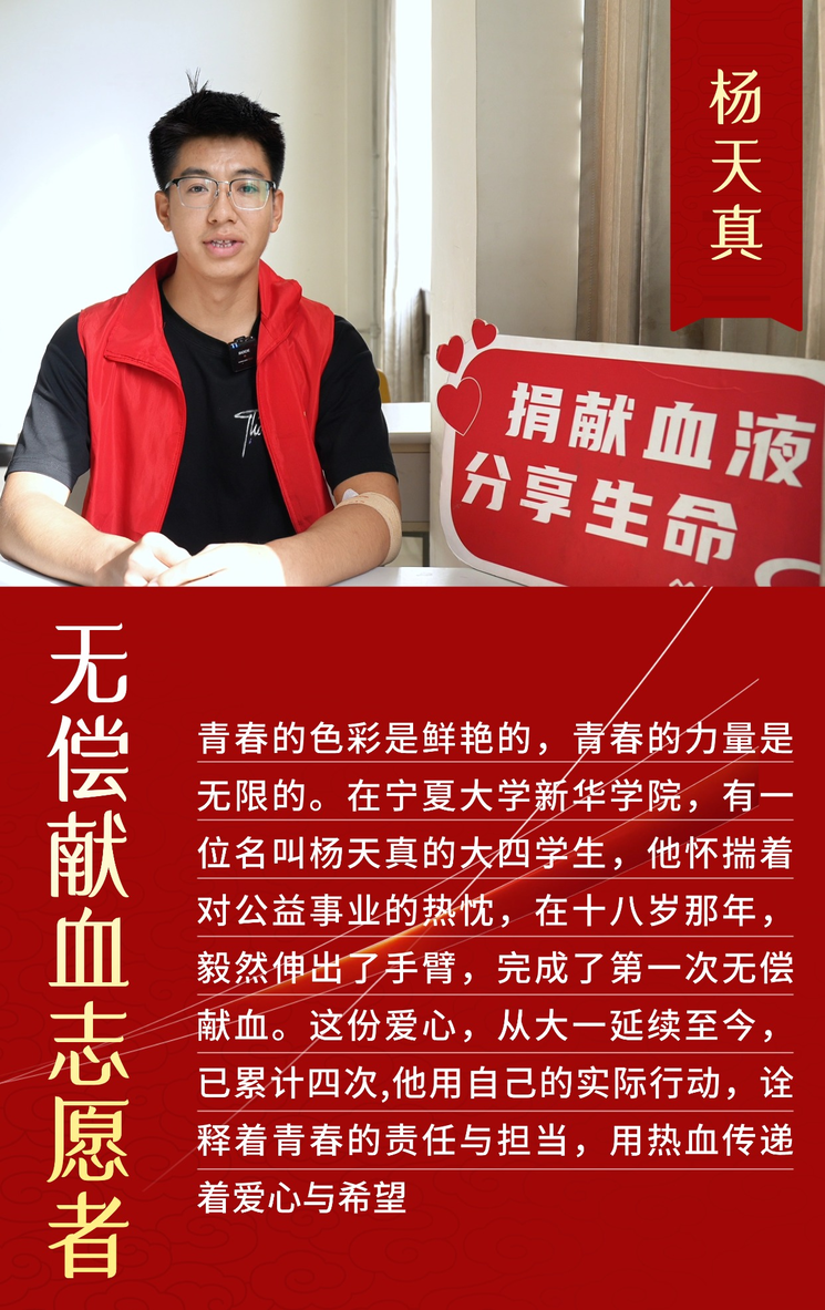青春的色彩是鲜艳的,青春的力量是无限的。在宁夏大学新华学院,有一位名叫杨天真的大四学生,他怀揣着对公益事业的热忱,在十八岁那年,毅然伸出了手臂,完成了第一次无偿献血。这份爱心,从大一延续至今,已累计四次,他用自己的实际行动,诠释着青春的责任与担当,用热血传递着爱心与希望。今天,让我们一起走进他的献血故事,感受那份青春正能量!