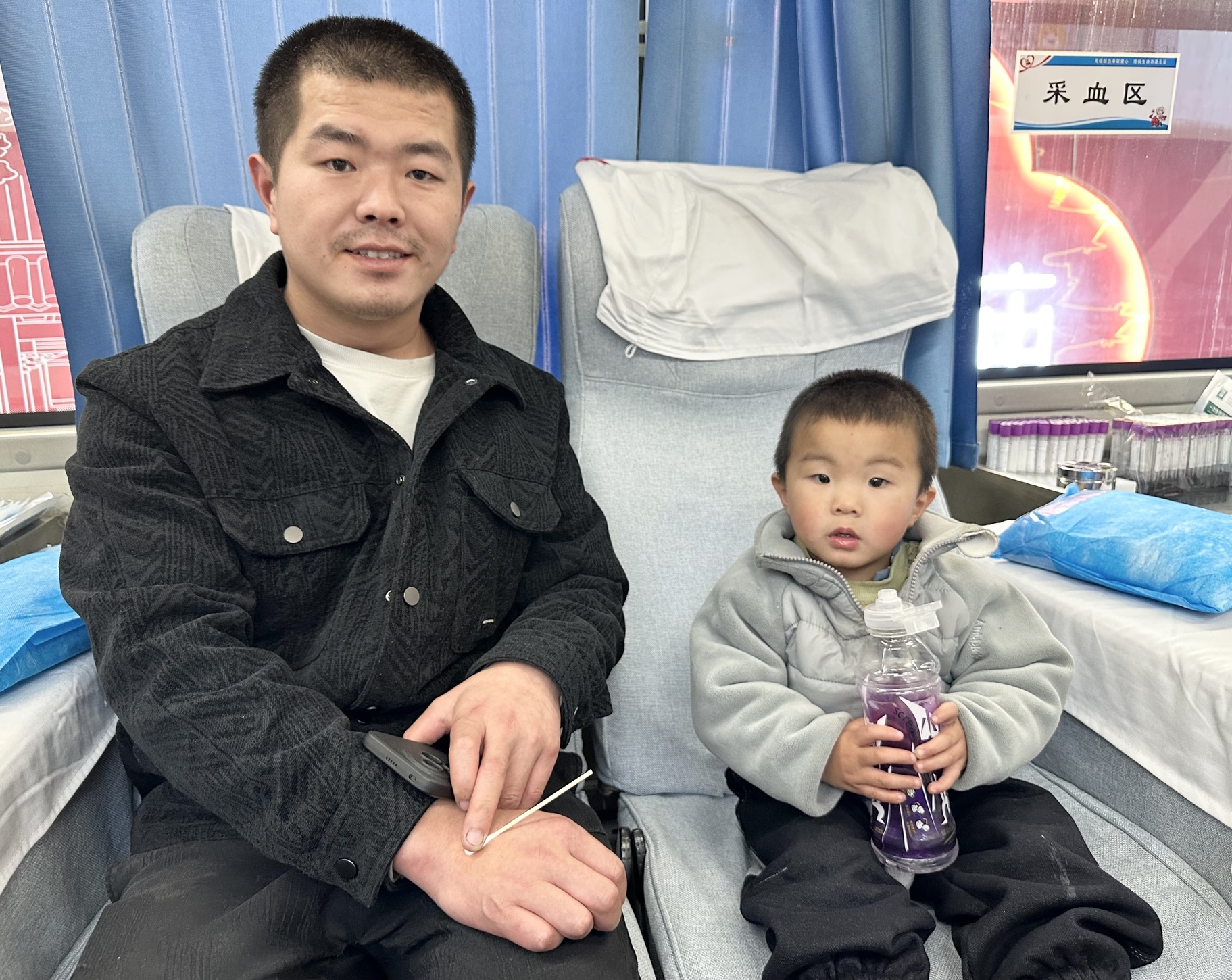 关团团先生趁着周末,陪妻子和儿子逛街时,一眼就看到了熟悉的采血车。这已经是他第五次参加无偿献血。当殷红的血液流入储血袋,年幼的儿子在一旁萌萌地看着爸爸,眼神里充满了好奇与崇拜,安静乖巧地等待着。