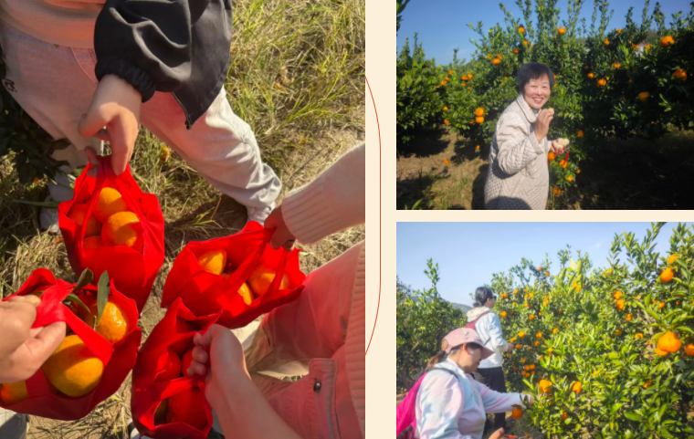 午餐过后,暖阳高照,志愿者们转场至闻名遐迩的易家河桔园,体验亲手采摘的乐趣。金灿灿的蜜桔挂满枝头,空气中弥漫着沁人心脾的果香。大家手持剪刀和提袋,热情高涨地投入“战斗”。经验丰富的伙伴主动示范采摘技巧,年轻的身影则灵活地穿梭于果树之间。有人负责采摘低处的果实,有人协作拉扯枝条采摘高处的“精华”,还有人负责搬运满载的果袋……园内处处是忙碌而欢快的身影,一派热火朝天的丰收景象。不一会儿,每个人的袋子里都已是“战果”累累,沉甸甸的,收获的不仅是甘甜如蜜的果实,更是共同协作带来的满足与喜悦。
