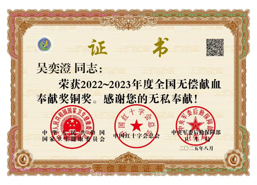 热血奉献,彰显担当。吴奕澄已经12次献血4800毫升,荣获了2022-2023年度全国无偿献血奉献奖铜奖。