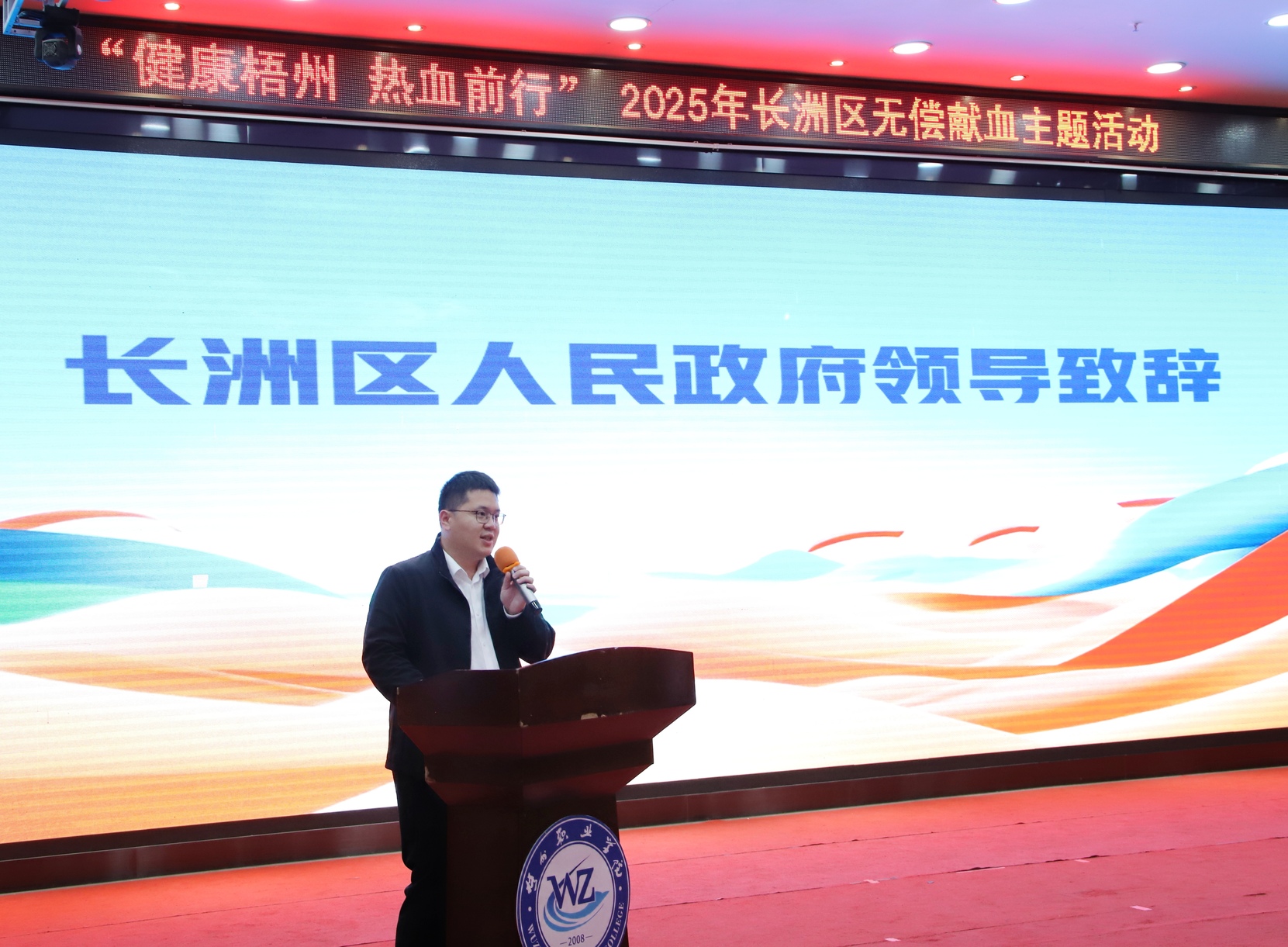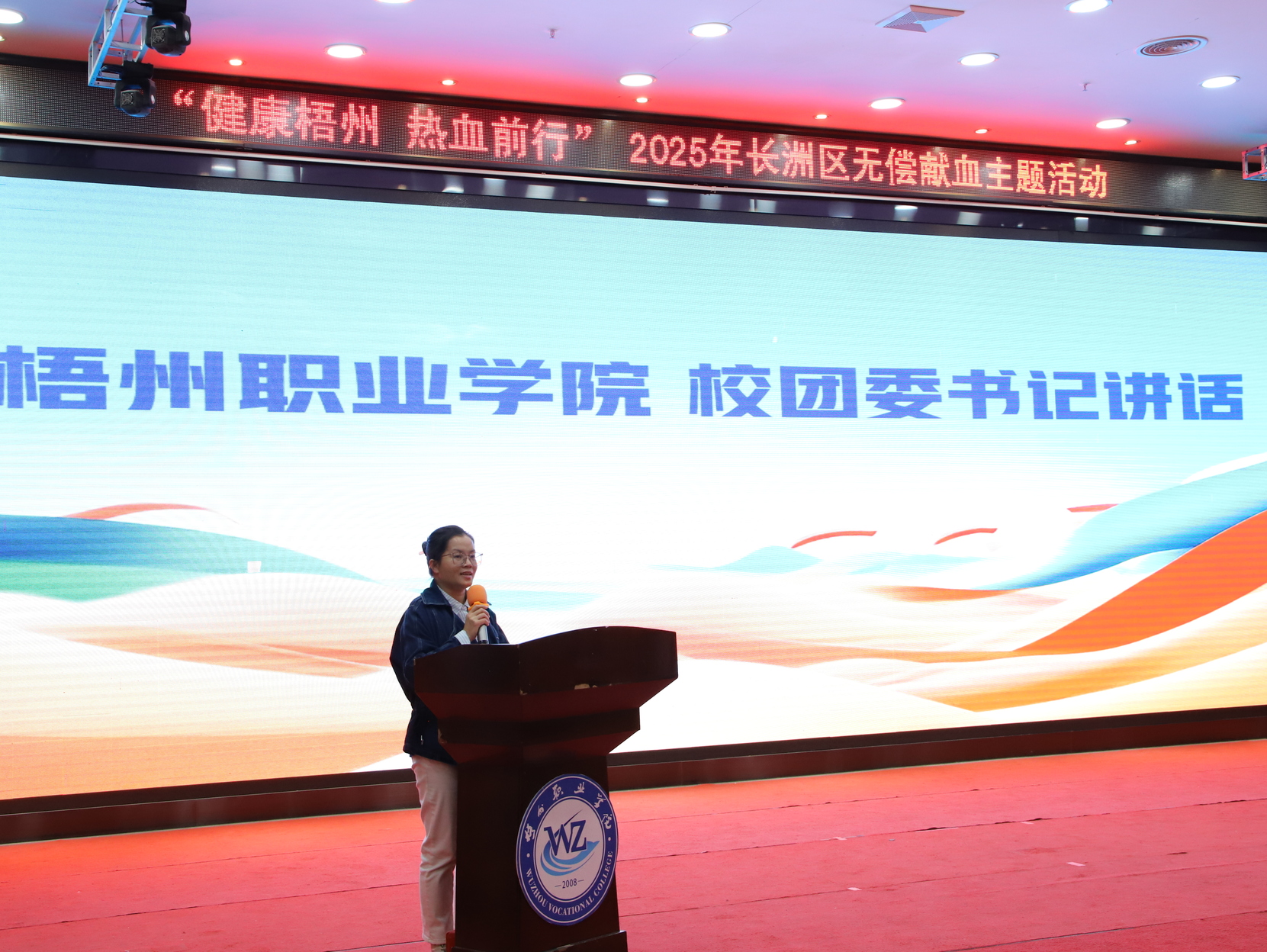 梧州职业学院团委书记韦敏玉在讲话中表示,学校将践行高校社会责任,积极动员青年力量,传递爱心火炬。献血者代表上台分享献血感悟,用亲身经历诠释爱心与责任。