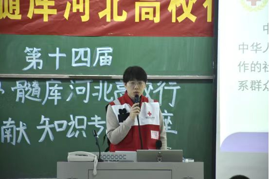 保定市红十字会办公室主任苏博渊首先以“让爱心传递,为生命加油”为主题系统讲解了国际红十字运动七项基本原则和人道、博爱、奉献的红十字精神,深入阐述了“三救三献”工作的核心内涵。