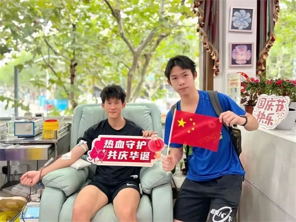 施先生(图右)是来自上海师范大学的一名在读研究生,这个国庆假期,他和朋友倪先生(图左)相约来捐献成分血。“前段时间,我们在一起收看阅兵式,当看到擎旗手将五星红旗高高扬起的那一刻,内心的激动无以言表。”两位小伙子说,现在的美好生活是无数革命先烈用鲜血换来的,用无偿献血这样的方式庆祝祖国母亲的生日,特别有意义。