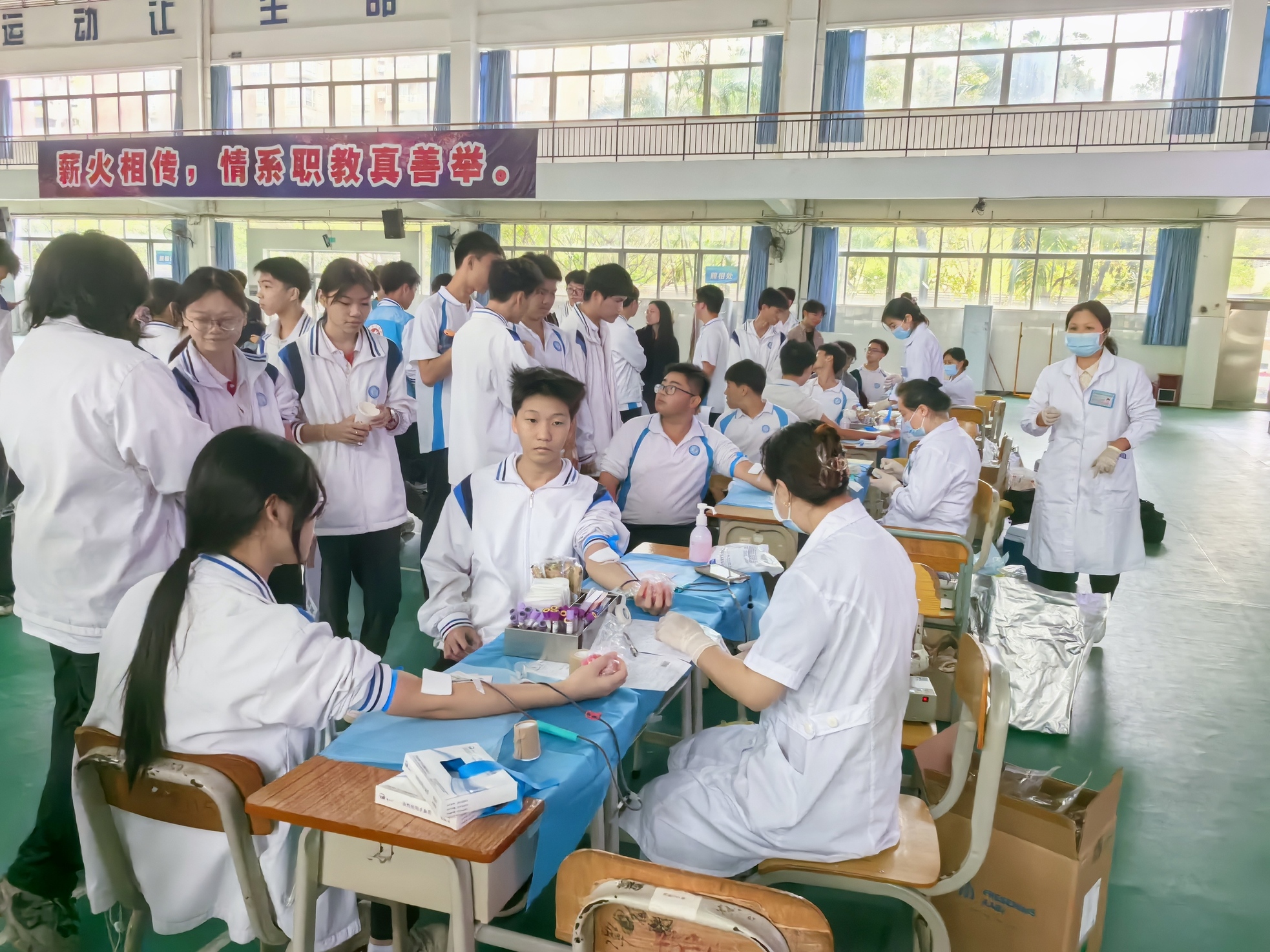 校园内,献血活动现场氛围热烈。等待区、体检区、采血区、休息区,各个环节衔接流畅,现场德育处老师细致的安排,学生志愿者们贴心的服务,医护人员专业的操作,共同保障了此次献血活动的高效与安全。