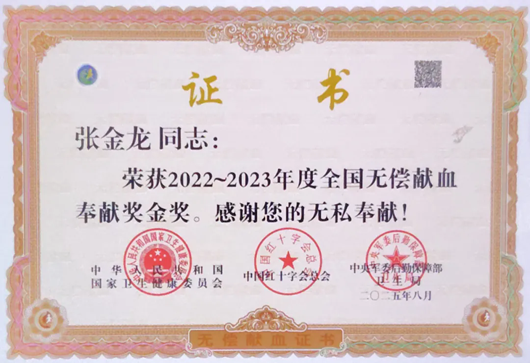 献血救人,积小善成大善。一个普通人通过热血奉献同样能获得至高无上的国家荣誉。8月20日,国家卫生健康委等部门发布《关于表彰2022-2023年度全国无偿献血表彰奖励获奖者的决定》,从事餐饮烧烤工作的张金龙荣获了全国无偿献血奉献奖金奖,在兴平市西吴镇传为佳话。