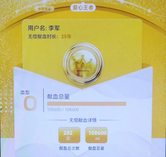 李军无疑是咸阳无偿献血第一人,他的无偿献血时长25年,至今282次献血108600毫升,荣获2020-2021年度全国无偿献血奉献奖终身荣誉奖,4次荣获全国无偿献血奉献奖金奖。