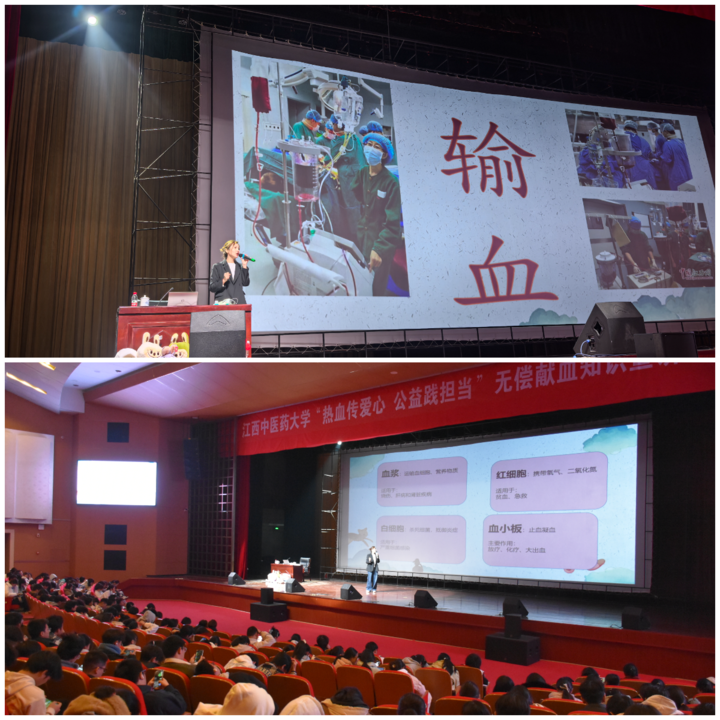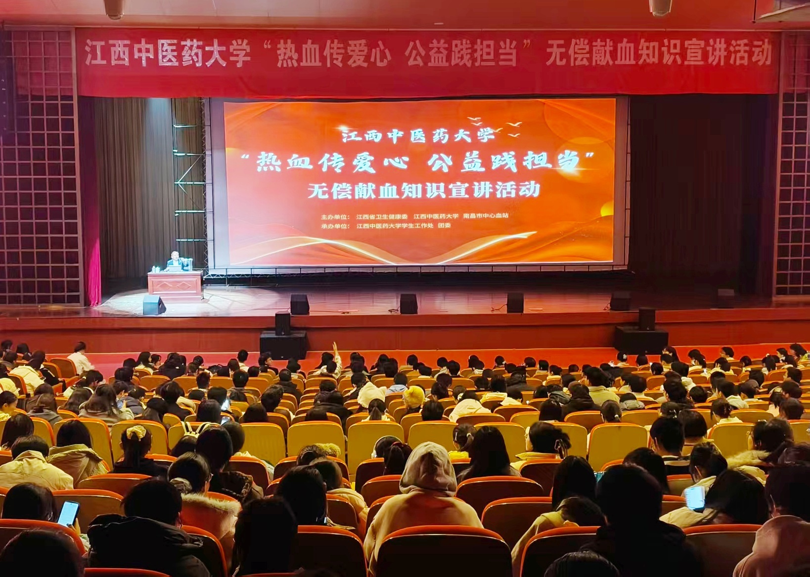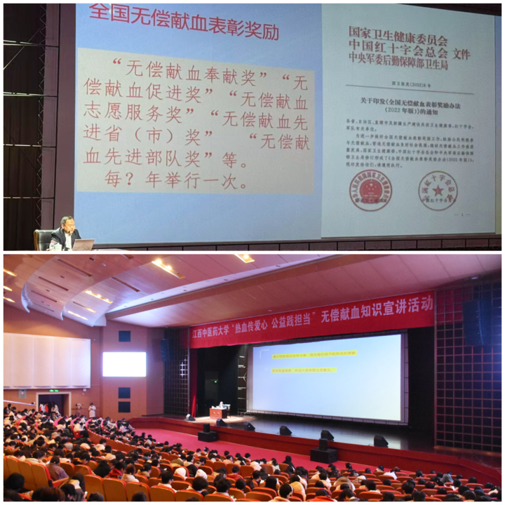 在《江西省献血条例》实施一周年到来之际,为进一步普及献血知识、“三免措施”,激发广大高校学子参与献血活动的热情,12月8日18:30,由江西省卫健委、江西中医药大学联合我站主办的“热血传爱心 公益践担当”无偿献血知识宣讲活动在江西中医药大学湾里校区开展,现场约800名师生到场聆听。