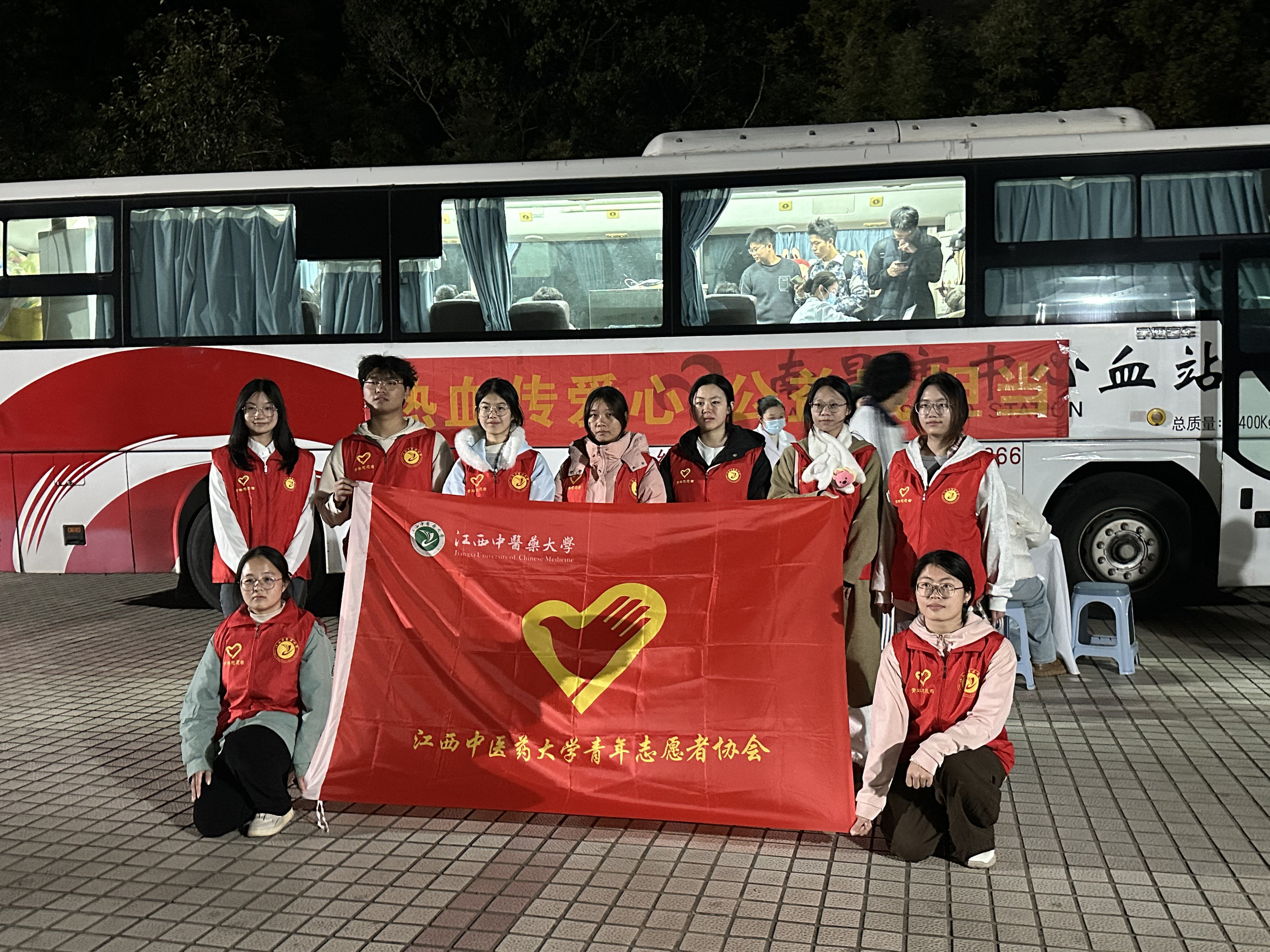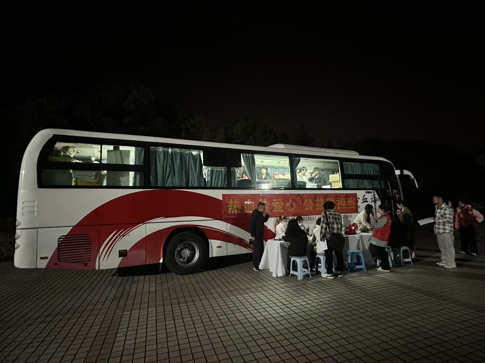 宣讲结束尾声时,尽管天色已暗,但现场仍有不少同学立即填写了“献血登记表”。我站也在宣讲礼堂的外面停放了流动献血车并设置了咨询台。现场,校志愿者向同学们发放宣传折页,温柔细致的服务与献血车的暖光交织,勾勒出夜晚校园里最动人的爱心图景,数十名同学走上献血车,撸起衣袖,用青春热血传递着正能量。