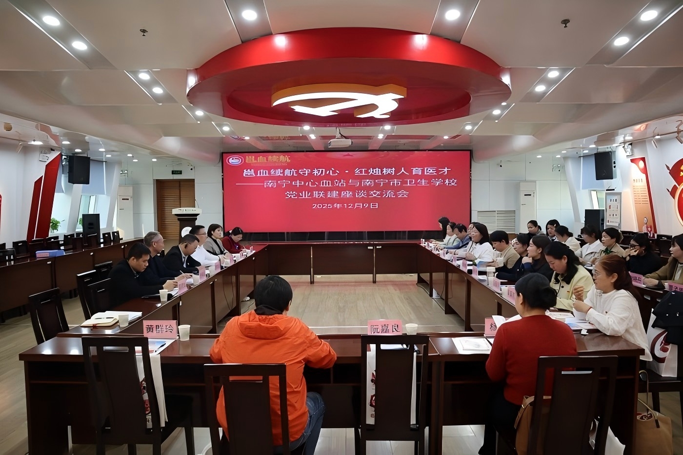 2025年12月9日,南宁中心血站党委与南宁市卫生学校党委在血站联合开展党业联建交流活动,双方围绕党建共建、无偿献血科普、学术合作等内容深入探讨与交流,为推动南宁市无偿献血事业与医学人才培养协同发展筑牢坚实根基。双方单位党委领导、党支部书记、支委及学生代表共170人参加活动。