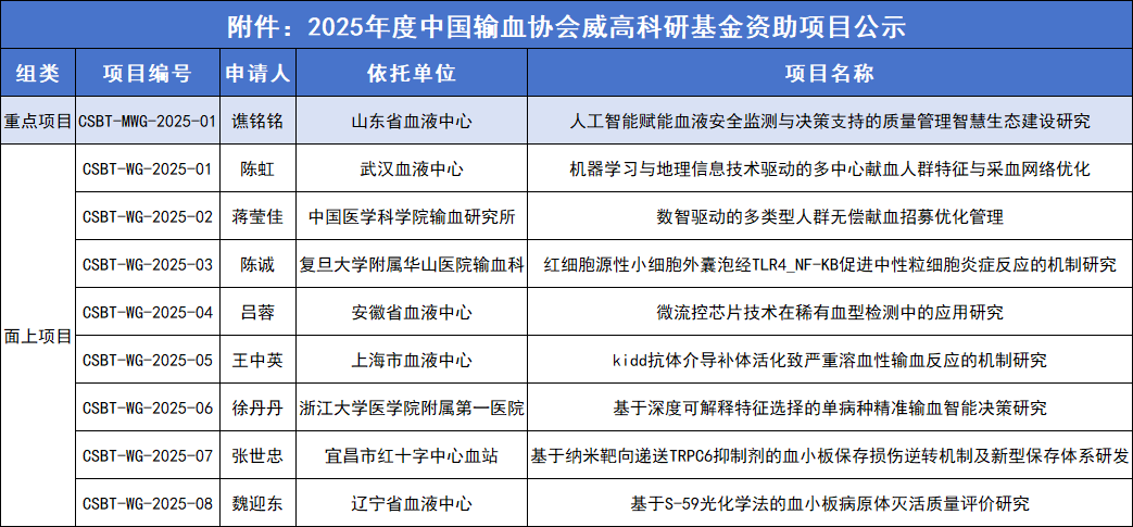 附件:2025年度中国输血协会威高科研基金资助项目公示