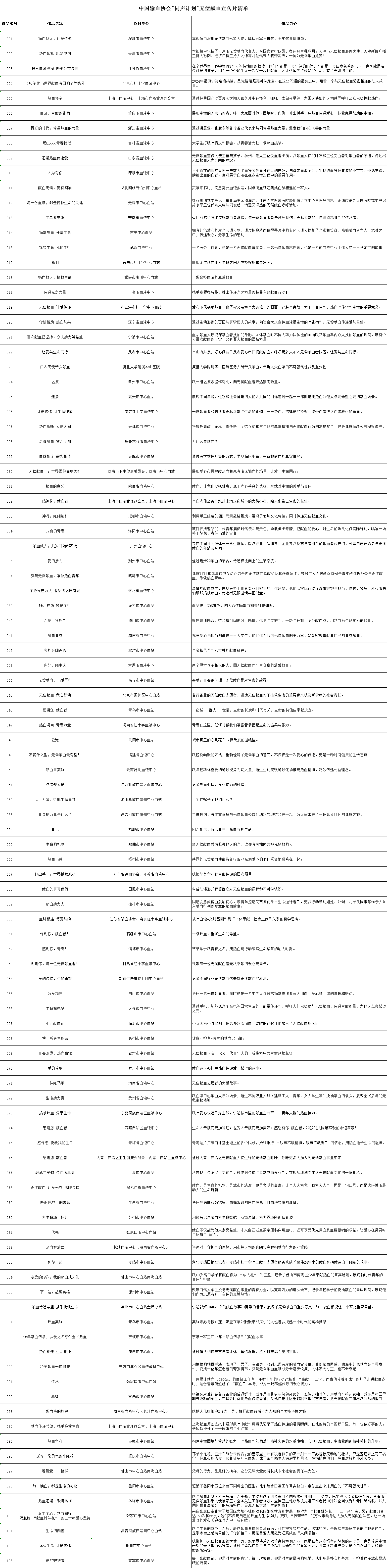 希望全国采供血机构,关心无偿献血宣传工作的单位、献血者志愿者和热心人士,充分利用单位或个人的网页、微信、视频号、献血点、流动车等,广为播放转发、分享、播放推荐的视频,实现“共享资源、共同发声、形成声势、营造氛围”的目标,更好地展现无偿献血的重要意义,讲好无偿献血的好故事,激发更多人关心、参与无偿献血!