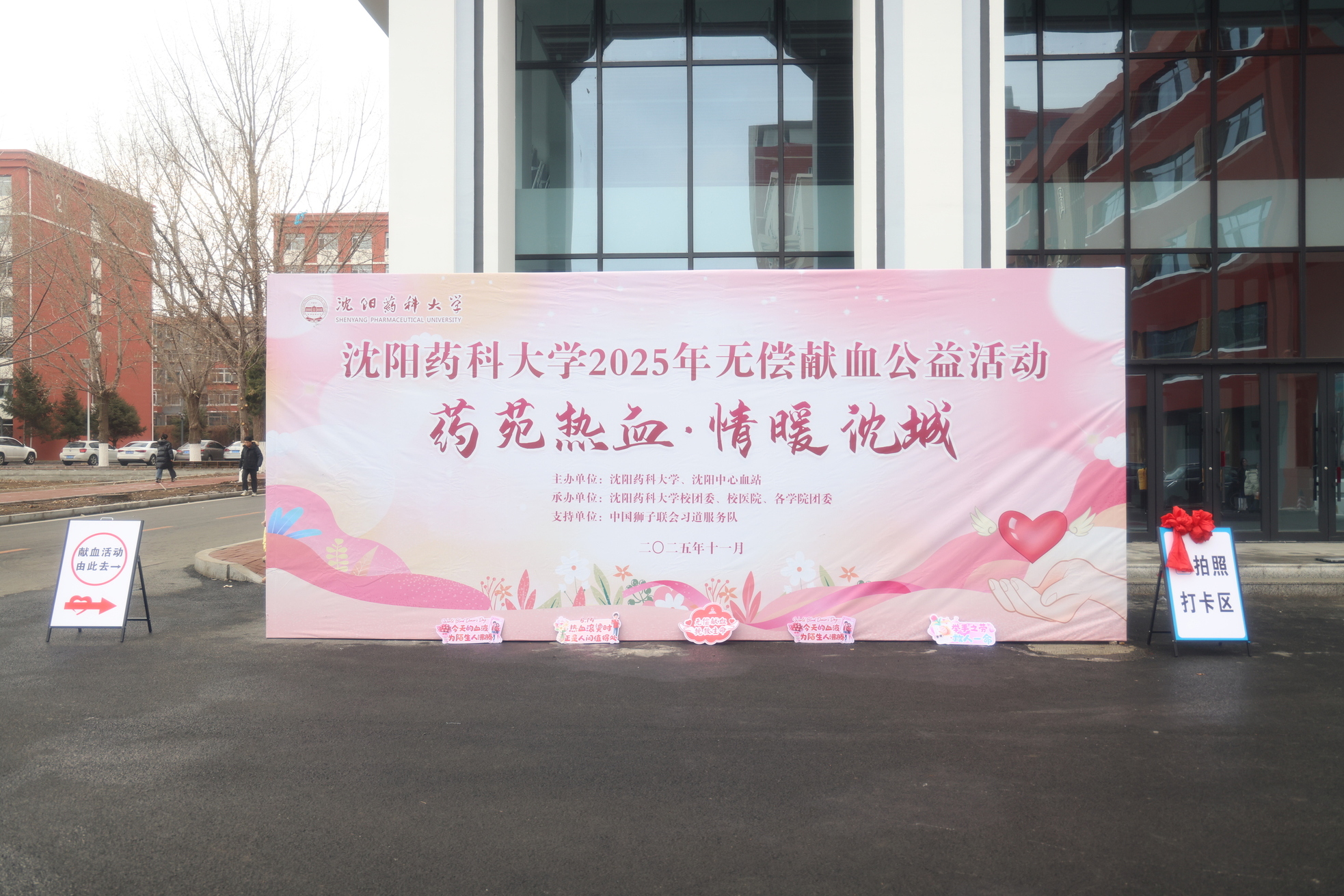 为让更多师生了解献血意义、参与公益行动,沈阳中心血站与沈阳药科大学紧密协作,联合支持单位中国狮子联会习道服务队提前筹备:前期不仅通过校园主题推文、宣传摆台、温馨海报传递献血流程与公益价值,中国狮子联会习道服务队走进校园开展公益宣讲,以鲜活故事点燃师生热情;活动现场,沈阳药科大学党委副书记关雪峰与沈阳中心血站站长魏迎东一同来到现场,关切询问活动进展,慰问参与献血的师生,用细致关怀为这场冬日里的奉献保驾护航。