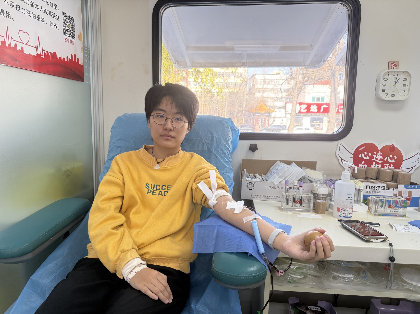 按照流程,宋奕诺依次完成了体检、血液初筛等检测,各项指标均符合献血标准。尽管父母未能陪伴在侧,起初她难免有些紧张,细心的工作人员敏锐察觉到她的忐忑,当即递上温热的糖水,用温柔的话语耐心安抚,舒解了她的不安。一袋200毫升的热血缓缓汇聚,承载着青年的赤诚与担当。献血过程中,宋奕诺神情平静而坚定,她轻声说道:“一想到父亲多年的坚持,想到这袋血液或许能为他人带去生的希望,就浑身充满了力量。”