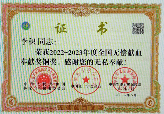 热血八年,获得奖励。12月15日,中铁二十局一公司职工李积来到咸阳市中心血站献血办,领取了2022-2023年度全国无偿献血奉献奖铜奖。他愉快地说:“我献血起步晚,只献了11次4400毫升。荣获至高无上的国家级奖项,这是一个值得骄傲的爱心荣誉。”