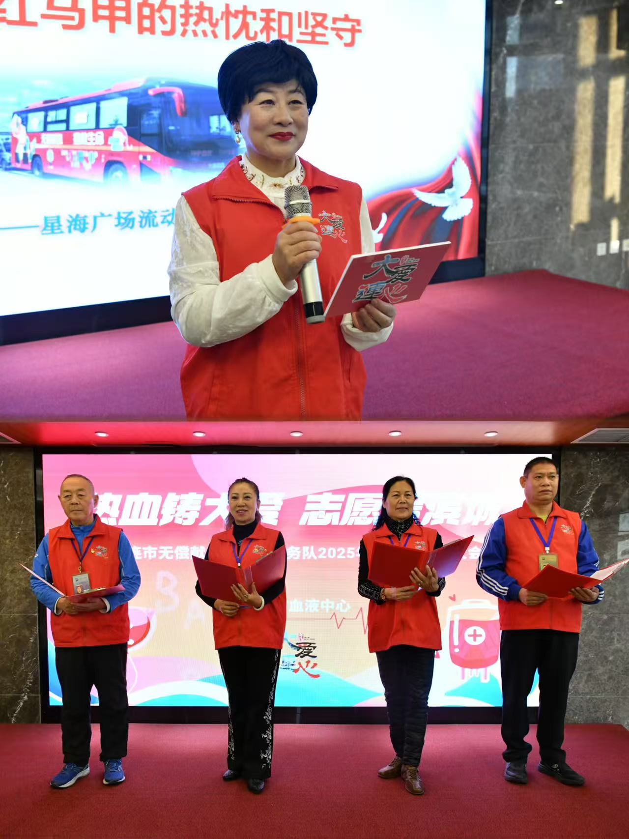 李炳臻生动再现了星海湾流动采血车的暖心故事 --五一假期里的坚守、十一秋风中的执着、中秋月色里的温情,以及外国友人跨越国界的公益参与,让现场观众深受触动。随后,谢绥、辛立荣、杨秀芝、梅卫华四位志愿者带来原创作品《红马甲,蓝胸卡》诗朗诵表演,真挚的情感、铿锵的话语展现了志愿者们“奉献不求回报、服务没有节假”的初心。