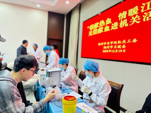 每年12月是江苏省无偿献血宣传月,为进一步弘扬社会正能量,促进无偿献血公益事业的发展,12月19日上午,扬州市委市级机关工委、扬州市卫健委联合开展“捐献热血,情暖江苏”无偿献血进机关活动。本次活动共有117人成功献血,累计献血量40000毫升。