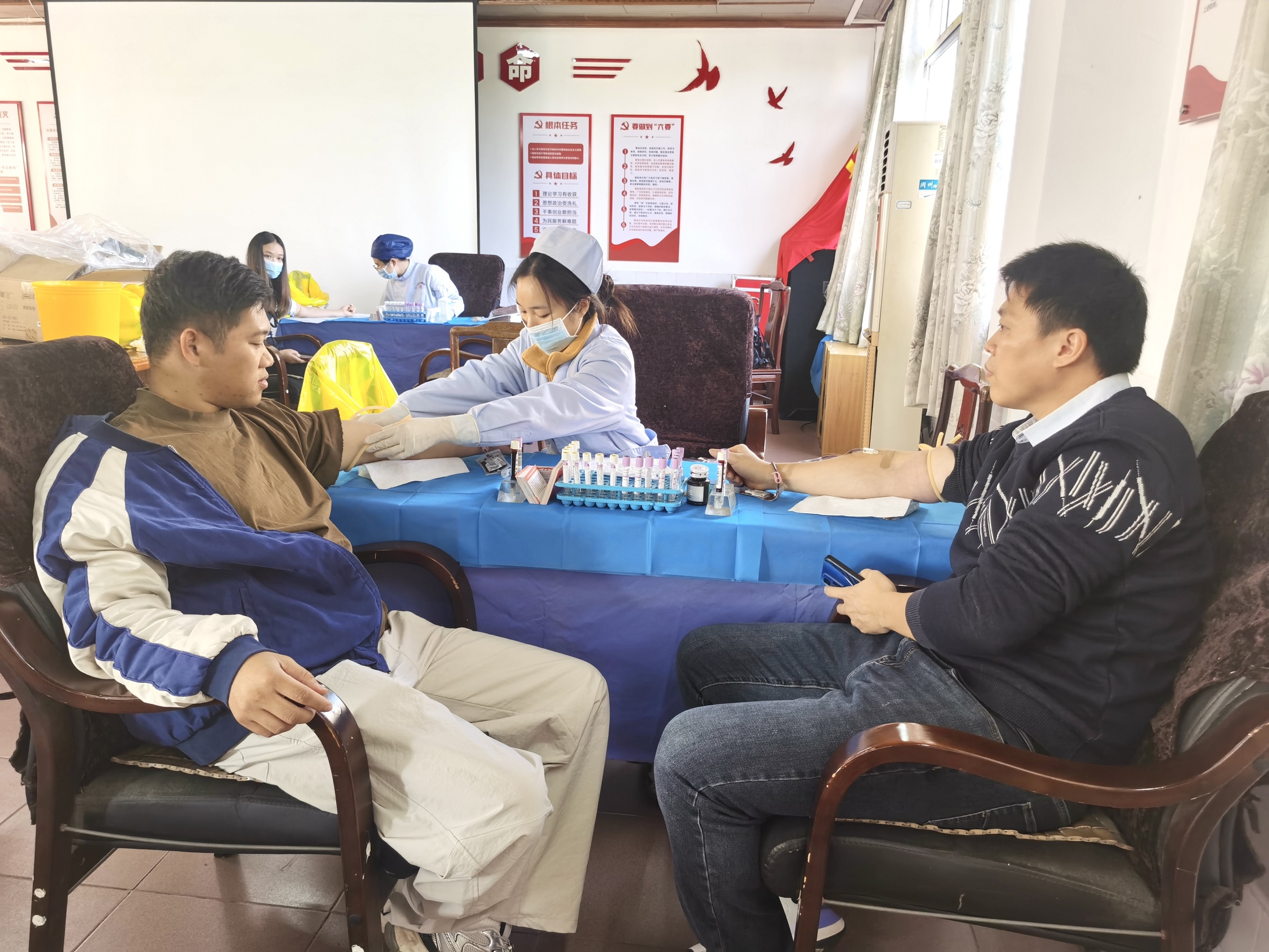 阳光明媚的清晨,新会区沙堆镇卫生院门前已有不少村民在有序的就诊,在二楼也有一群熟悉的身影,他们根据指示积极响应号召,踊跃参与这次无偿献血活动,以热血传递爱心,用行动诠释担当,共同为保障临床用血、守护生命健康贡献力量。
