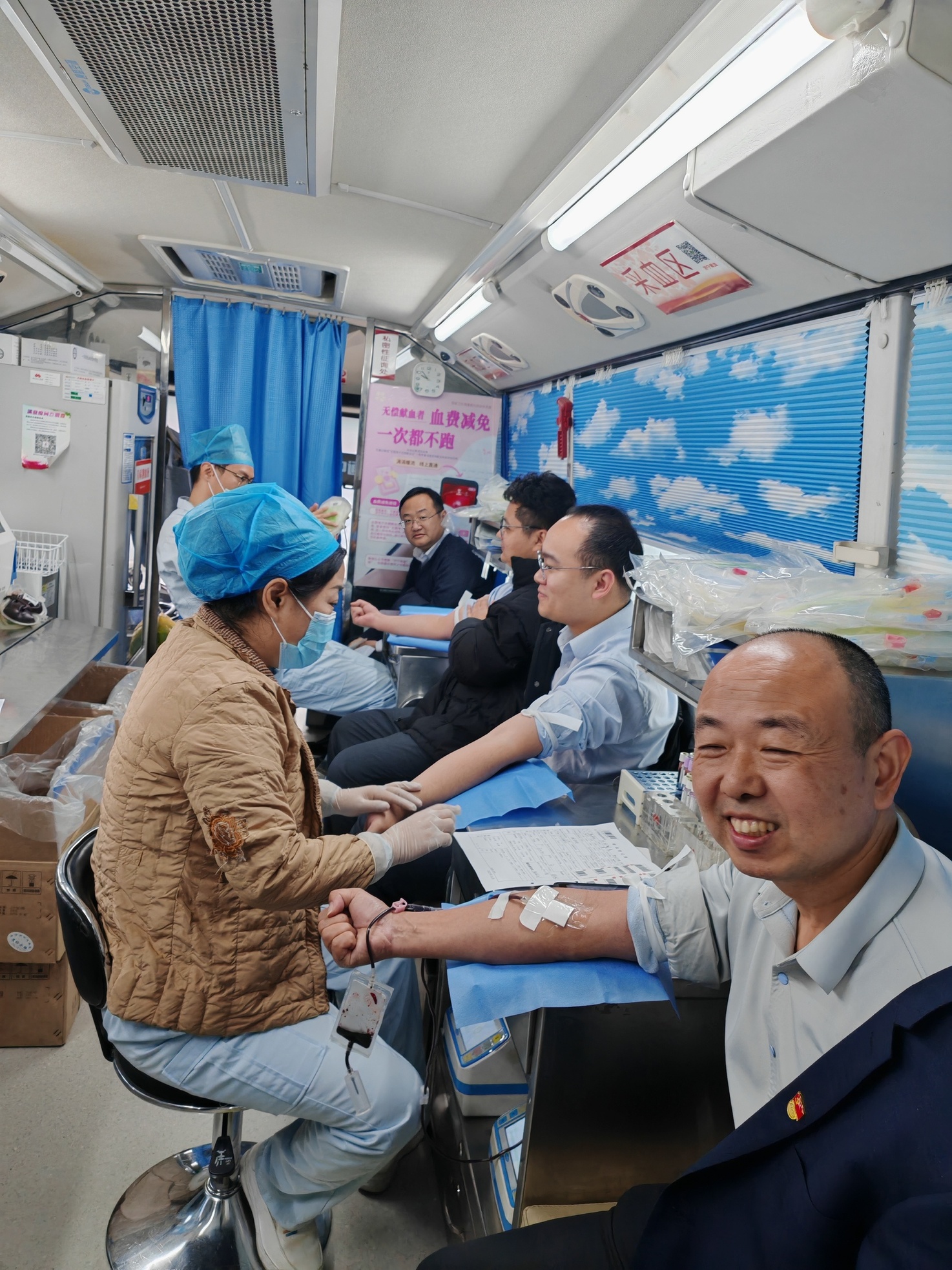 在杨行长的带动下,全行员工踊跃参与,队伍里既有深耕行业多年的老员工,也有刚入职的青年职员。不少员工已是无偿献血的“常客”,他们熟练地配合医护人员完成采血;首次参与的年轻员工虽略显紧张,但脸上满是自豪,纷纷表示能为公益事业出力,是一次特别有意义的体验。采血过程中,血站医护人员耐心讲解献血后的注意事项,银行工会则贴心准备了营养饮品、点心和纪念礼品,让献血者感受到浓浓的关怀。