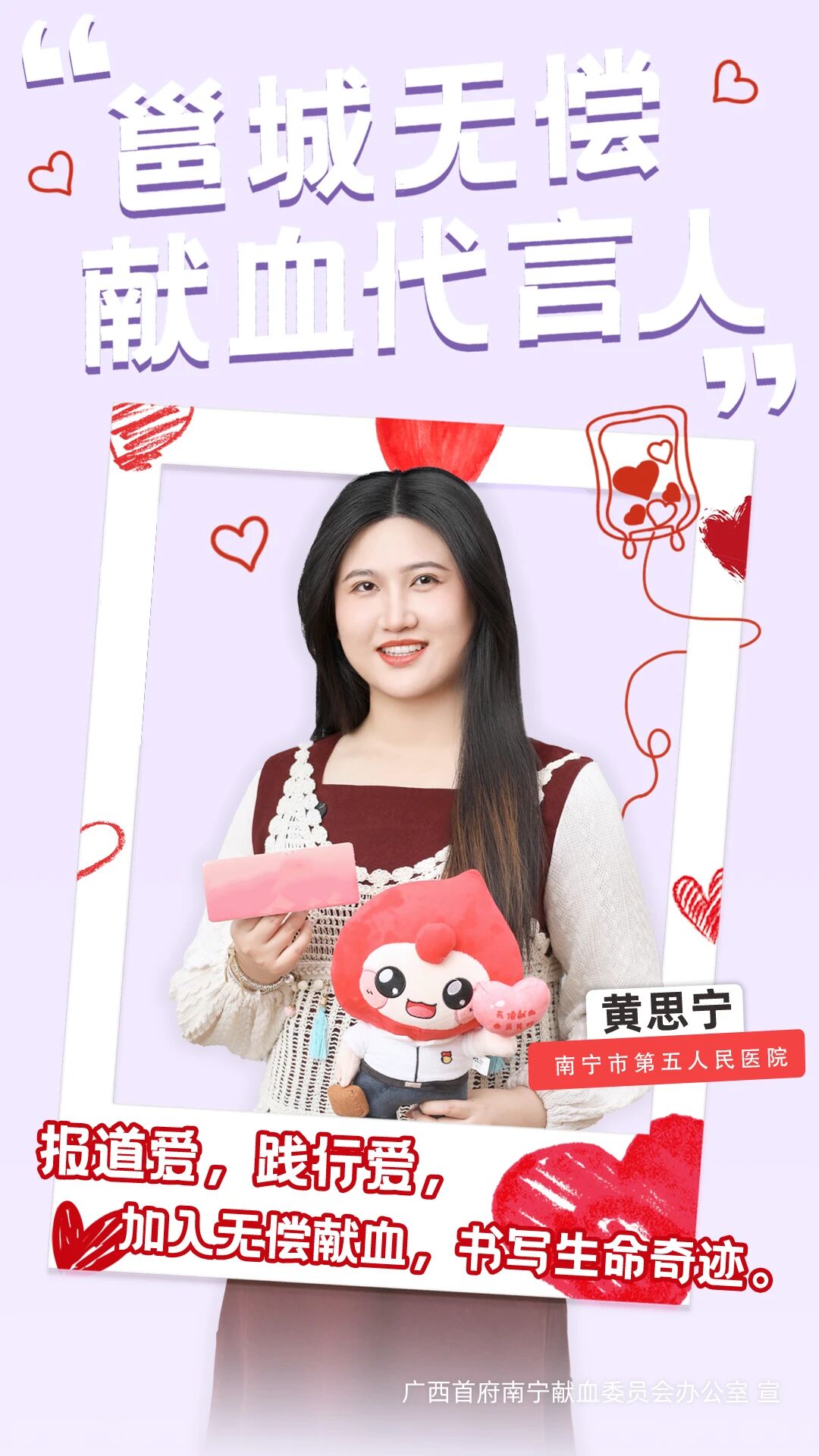 2025年,黄思宁受聘成为“邕城无偿献血代言人”。这份荣誉于她,是鼓励,更是责任。在职业赛道转变后,让黄思宁对无偿献血的意义有了更深的体会。进入南宁市第五人民医院从事宣传工作后,她站在了临床用血的第一线,也更直接地承担起宣传和动员医护人员参与献血的责任。