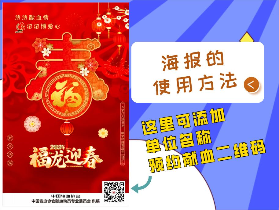 以上宣传画的高清原图可点击下方蓝字,自行下载使用。宣传画上可以添加当地献血预约或本单位官方微信公众号二维码;宣传画下方空白处还可以填入当地或本单位名称,示意图如下。
