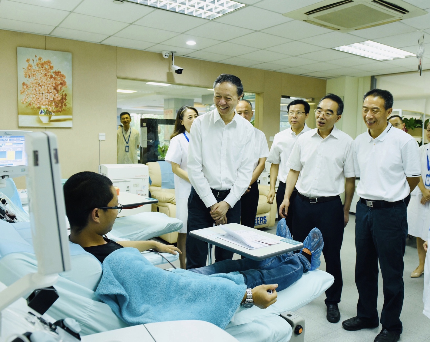 上午9点30分,王一宏副省长一行到达中心,首先听取了中心主任傅雪梅对成都市血液保障工作情况以及牵头全省采供血工作情况的汇报,接着实地走访了中心储血供血科和血液采集室,了解血液采集、储备和供应的工作情况。慰问过程中,王一宏副省长详细询问和关心了中心医务人员日常工作情况,对大家的辛勤付出表示感谢,希望大家继续努力,做好采供血工作,全心全意保障人民群众身体健康。在血液采集室,王一宏副省长还亲切慰问了献血者和志愿者,感谢他们积极参与无偿献血工作。王一宏副省长强调,血液工作很重要,要牢记初心使命,把好血液保障的底线和血液安全的红线,扎实做好新时代血液工作,有效保障好临床血液供应和安全,守护好人民群众生命健康。