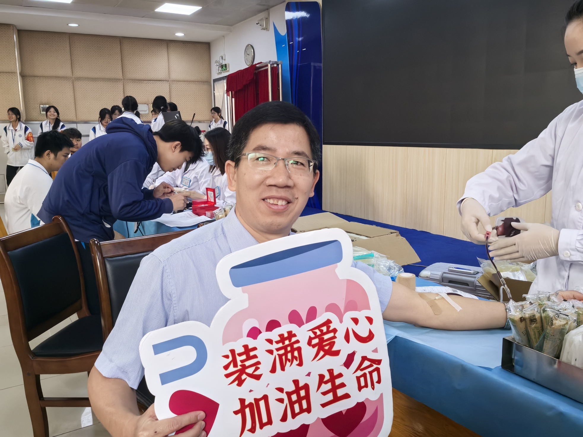 “看到老师这么坦然,我的紧张感就少了一大半。”首次献血的小林同学说。在魏老师的鼓励下,许多第一次献血的同学勇敢挽袖。在血站工作人员的指引下,同学们完成登记、体检、采血等流程。整个现场秩序井然,爱心的暖流在师生间传递。