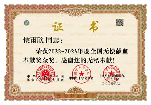 青春在奉献中闪光!8月20日,国家卫生健康委等部门发布《关于表彰2022-2023年度全国无偿献血表彰奖励获奖者的决定》,零零后侯雨欣荣获了全国无偿献血奉献奖金奖。