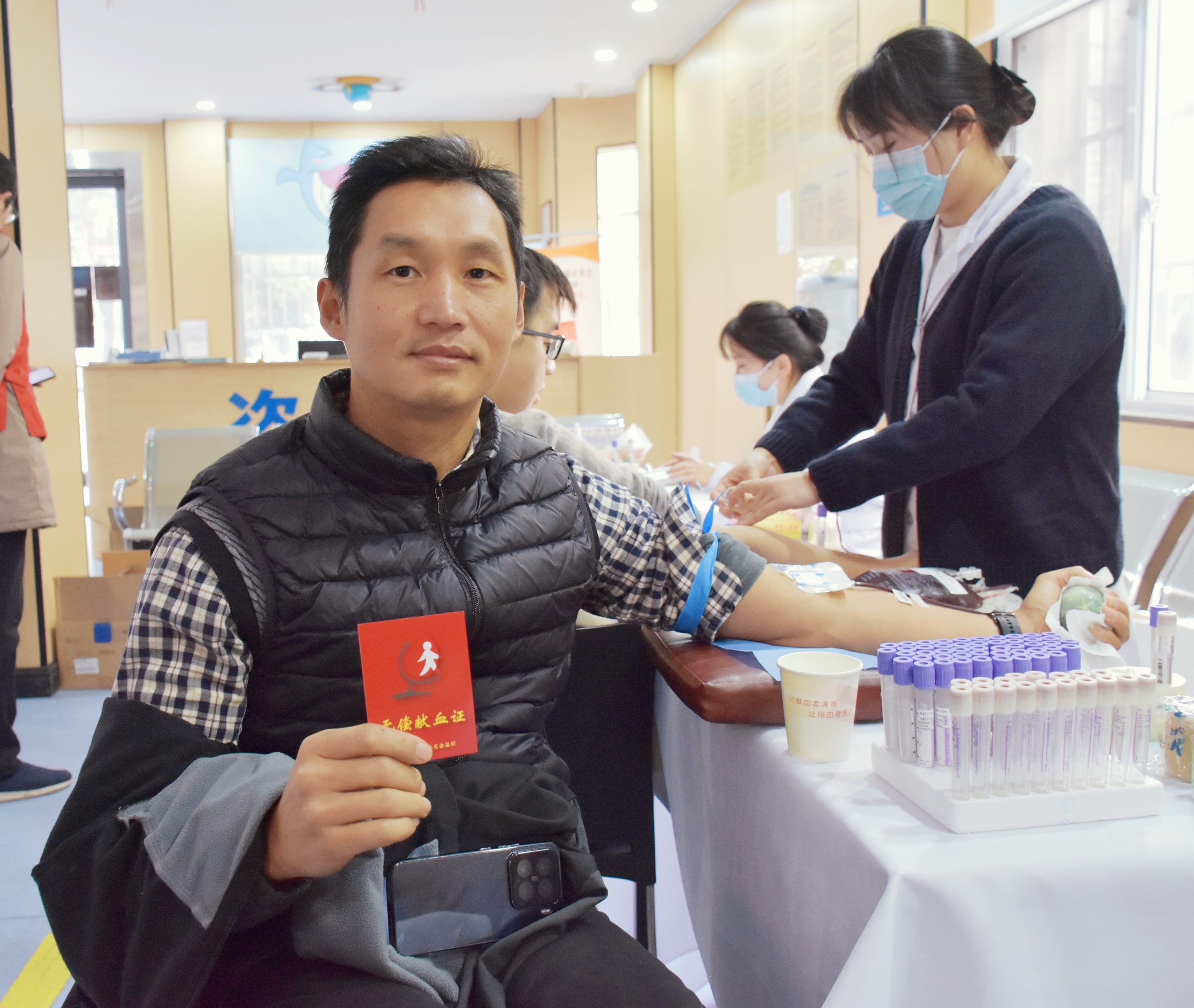 来自罗家镇的魏志强这是他第7次献血,一共献血1600毫升。他说:“献血是一件很光荣的事,不仅仅可以帮助家人,也可以帮助有需要用血的患者。”