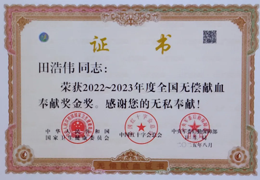 热血钓台,爱心氛围浓厚。8月20日,国家卫生健康委等部门发布《关于表彰2022-2023年度全国无偿献血表彰奖励获奖者的决定》,沣西新城钓台街道办爱心青年田浩伟荣获了全国无偿献血奉献奖金奖,爱心方阵再添新成员,热血奉献成为时尚。