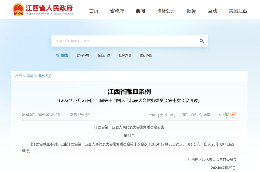 1月1日,《江西省献血条例》正式施行,明确符合健康检查要求者献血年龄可延长至65周岁,江西无偿献血事业迈入法治化提质升级新阶段。岁末,《中华人民共和国献血法(修订草案征求意见稿)》向社会公开征询,拟将全血献血间隔调整为90天一次,全国性法治完善进程同步启动。习近平总书记两次就无偿献血工作作出重要指示,并在“十四五”时期聚焦血液安全作出系列部署,《“十四五”国民健康规划》明确“提高血液应急保障能力”;李强总理作出批示,提出明确的要求;刘国中副总理进行专题研究,作出工作部署。