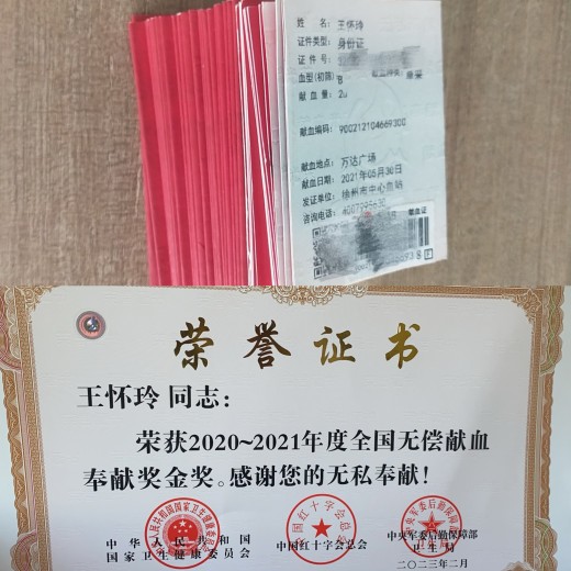 献血44次的女中豪杰王怀玲,累计捐献全血400毫升、单采血小板86治疗单位。
