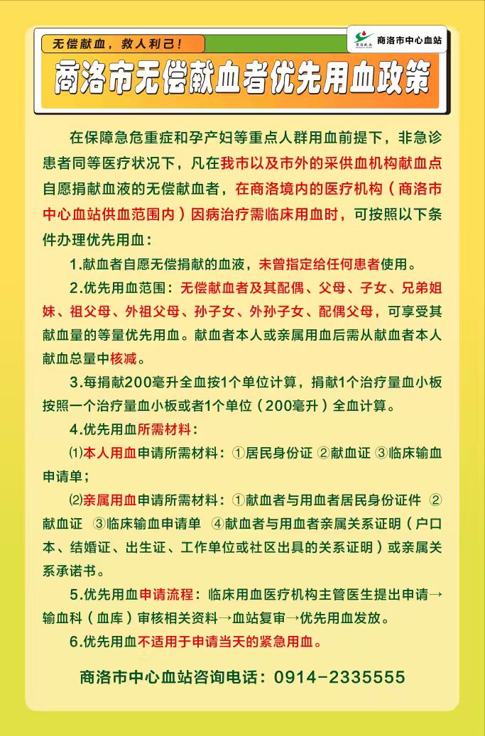 为切实保障献血者本人及其亲属的优先用血权益,我市严格贯彻落实《关于进一步做好无偿献血者激励奖励工作的通知》(国卫办医急发〔2023〕20号)文件精神,细化落实《商洛市无偿献血者优先用血政策》,将优先用血亲属范围扩大至9类,涵盖无偿献血者本人及配偶、父母、子女、兄弟姐妹、祖父母、外祖父母、孙子女、外孙子女、配偶父母,以政策温度回应献血者的爱心奉献。