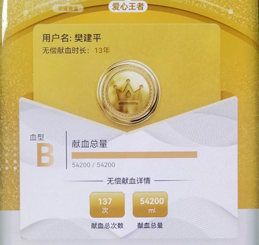 近日,樊建平来到咸阳市中心血站献血办,领取了2022-2023年度全国无偿献血奉献奖两项大奖。他已经3次捐献全血1200毫升,134次捐献265个治疗量的机采血小板,献血总量达到54200毫升,登上献血光荣榜。热血坚守,获得大奖,令人敬仰。