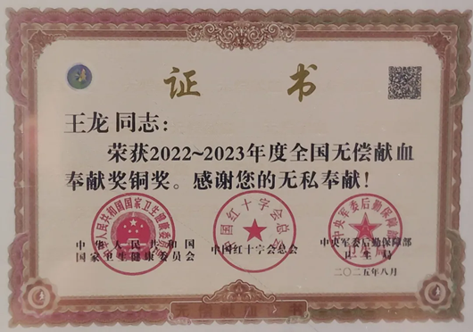 热血担当,贵在坚持。王龙热血救人在同事和亲友中传为佳话,多次被单位评为先进个人,还荣获2023年全省优秀警务辅助人员和岗位学雷锋标兵多项殊荣。王龙说,全国无偿献血奉献奖是他工作以来众多表彰中最骄傲最自豪的一项荣誉,他的父母妻子和女儿都感到特别高兴。