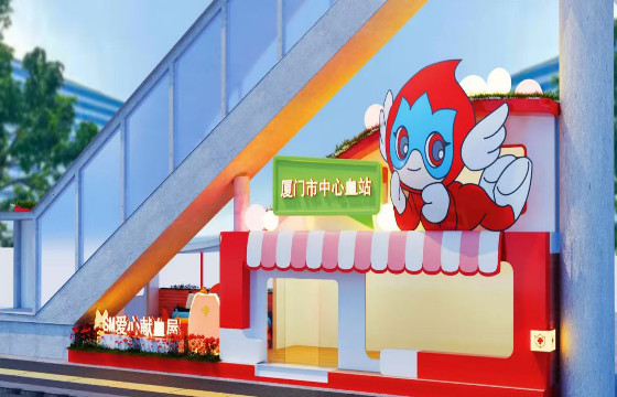 萌趣的“厦小血”俏皮地趴在小屋上,邀请着每一位爱心人士走进这座“爱心能量站”,用热血传递温暖。
