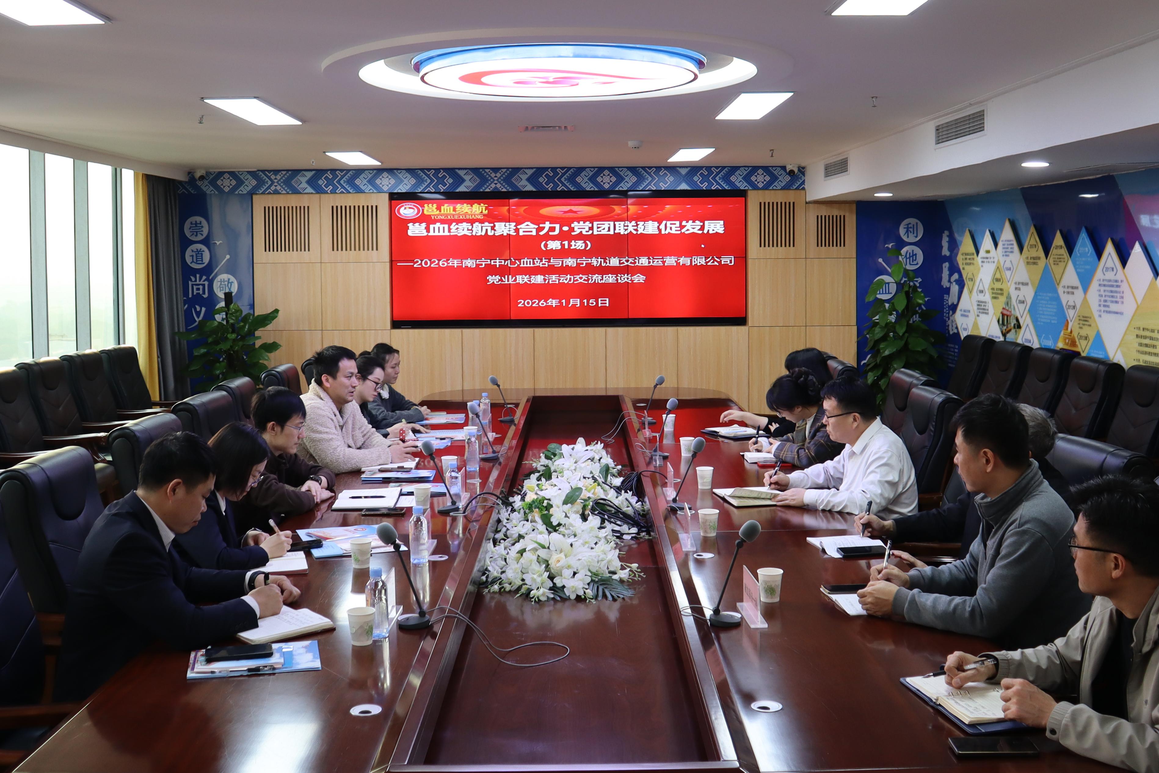 为深化企事业单位党团组织交流协作,探索党建引领公益事业发展新路径,2026年1月15日下午,南宁轨道交通运营有限公司党群工作部部长、团委书记于深率队赴南宁中心血站开展以“邕血续航聚合力 党团联建促发展”为主题的联建交流活动。活动以党团组织为桥梁,突破单位界限与行业壁垒,探索新时代背景下如何通过创新组织联建模式,增进理解、凝聚共识,共同谋划推动无偿献血公益事业与城市公共服务体系深度融合、协同发展。