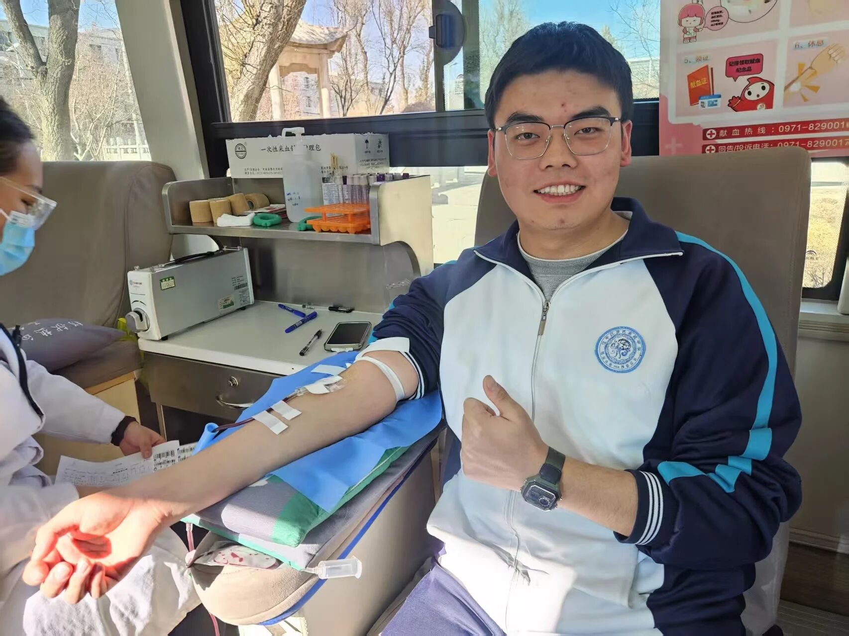 献血车上,师生们有说有笑,为自己能对社会做一点力所能及的事感到自豪,同时也用嫣然笑语冲谈采血过程中产生的紧张心理。填表、体检、检验、耐心等候、排队献血,整个过程始终都在轻松、和谐地氛围中有序进行。时时洋溢温暖,处处流淌感动。