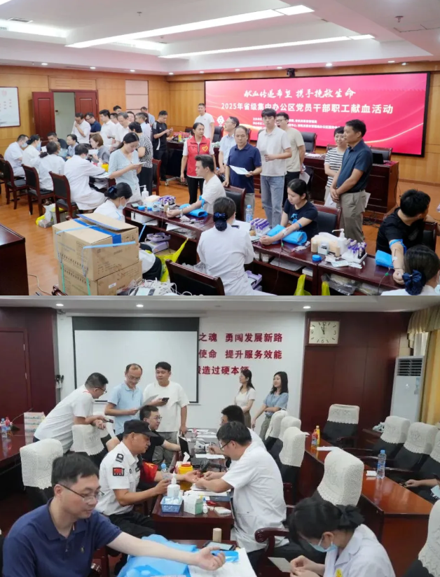 2025年7月24日,组织开展“献血传递希望 携手挽救生命”--2025年省级集中办公区党员干部职工集中献血活动。活动由省直机关工委、省卫生健康委、省机关事务管理局联合主办,省直机关工会工委、省血液中心、省机关事务管理局办公区服务中心承办,相关厅局领导到活动现场慰问献血者。现场500余名党员干部职工积极参与,最终成功献血11万余毫升。